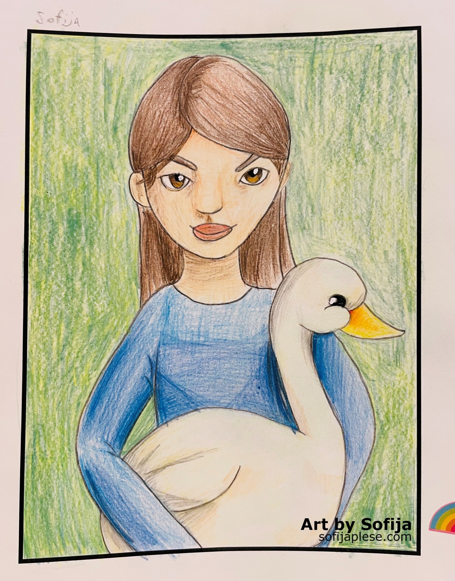This is my girl with the swan. I really like it because the swan is very cute. I used colored pencils for it. For the beak I used some red, a little bit of pink, dark orange, light orange and some yellow in it. This picture was very hard because the eyes were very, very, very tricky to draw, and it took me a long time to draw them. For the hair, I drew a lot of lines to take it more realistic. I was really happy to move into the Tone Course One at my class after this picture was done.