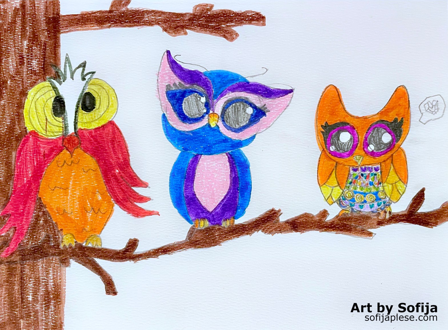 This is another picture of my family as owls. My dad is the one with red wings, my mom is the one in the middle, and I am the cutest one on the right 🙂