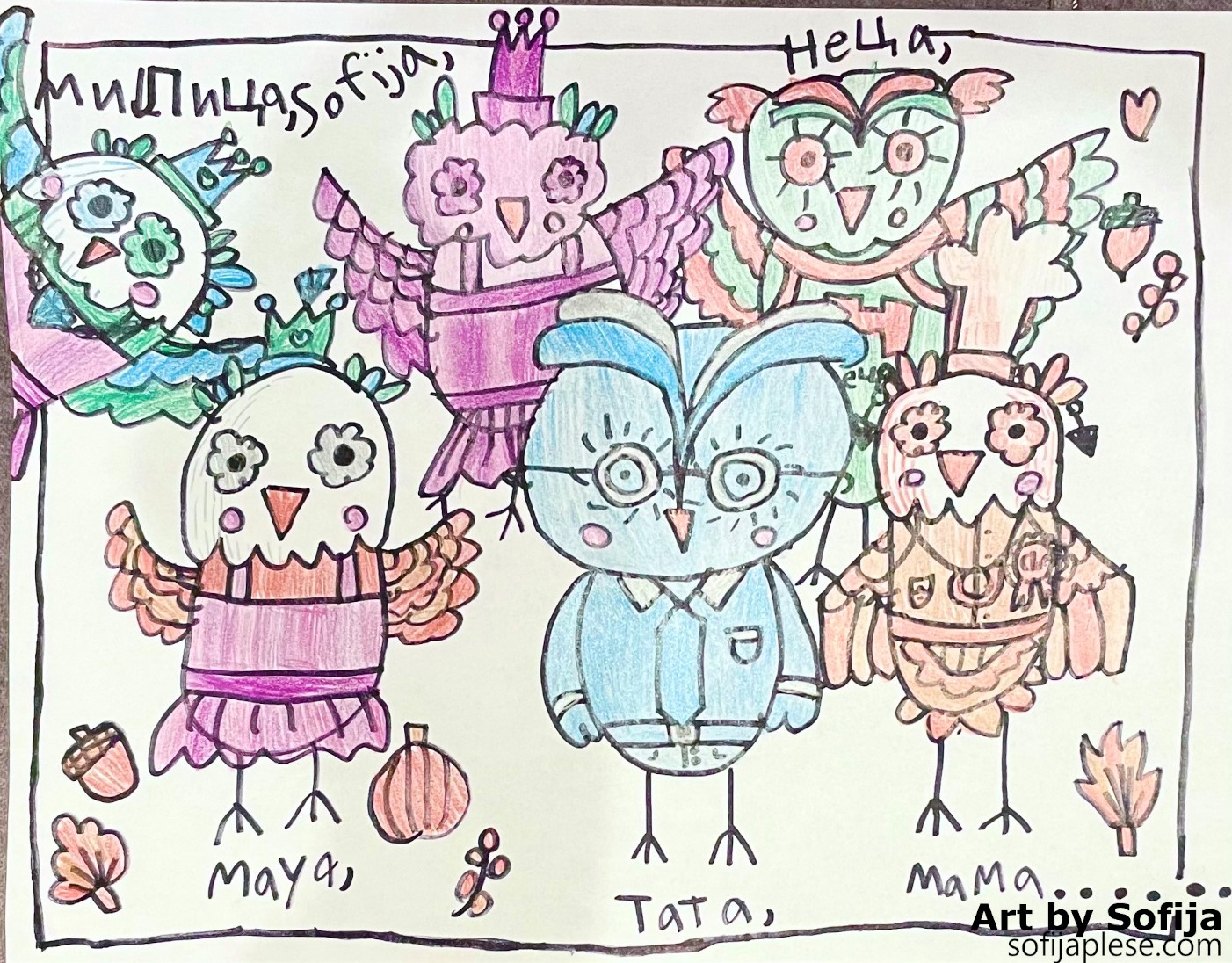 This is my family depicted as owls. I drew this picture to show my family members. If you take a closer look you’ll see that it was created in Fall. Can you guess why it was in the Fall?